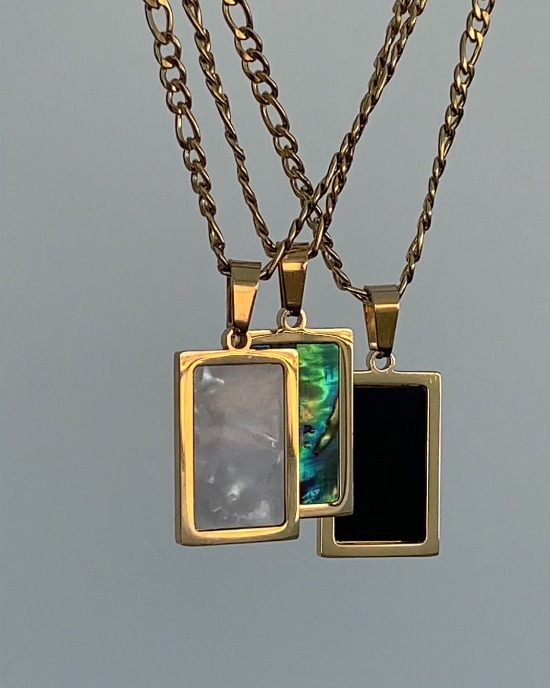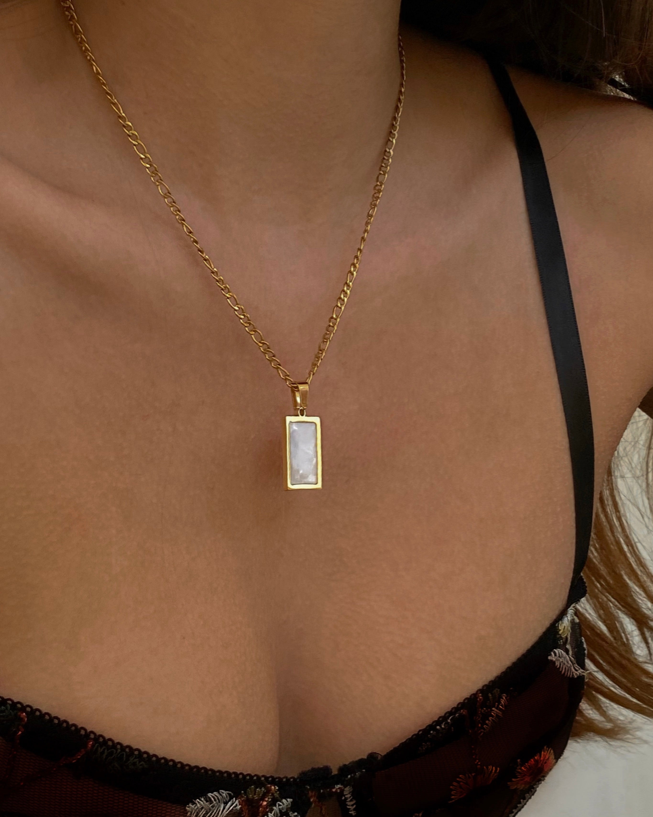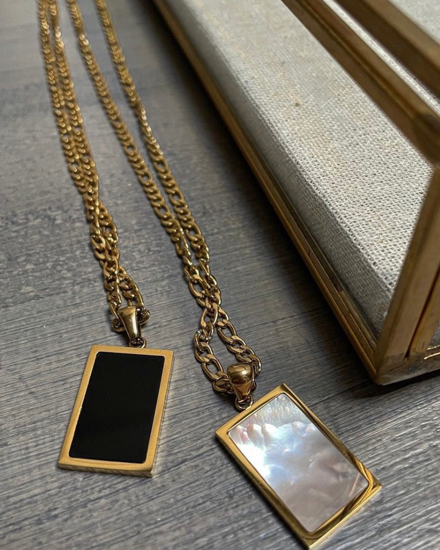 Estilo moderno com um toque clássico. Conjunto com colar e anel dourados, ambos com aplicação retangular em madre pérola. Ideal para um visual distinto e sofisticado.